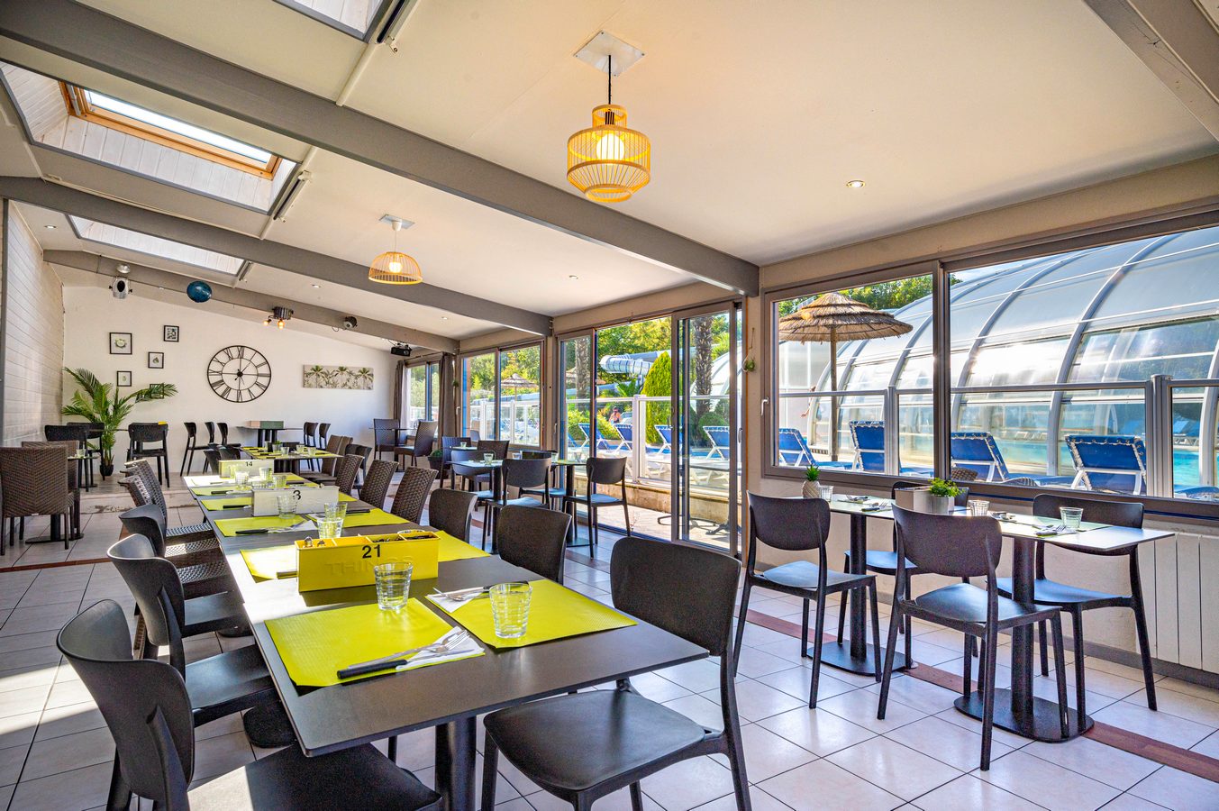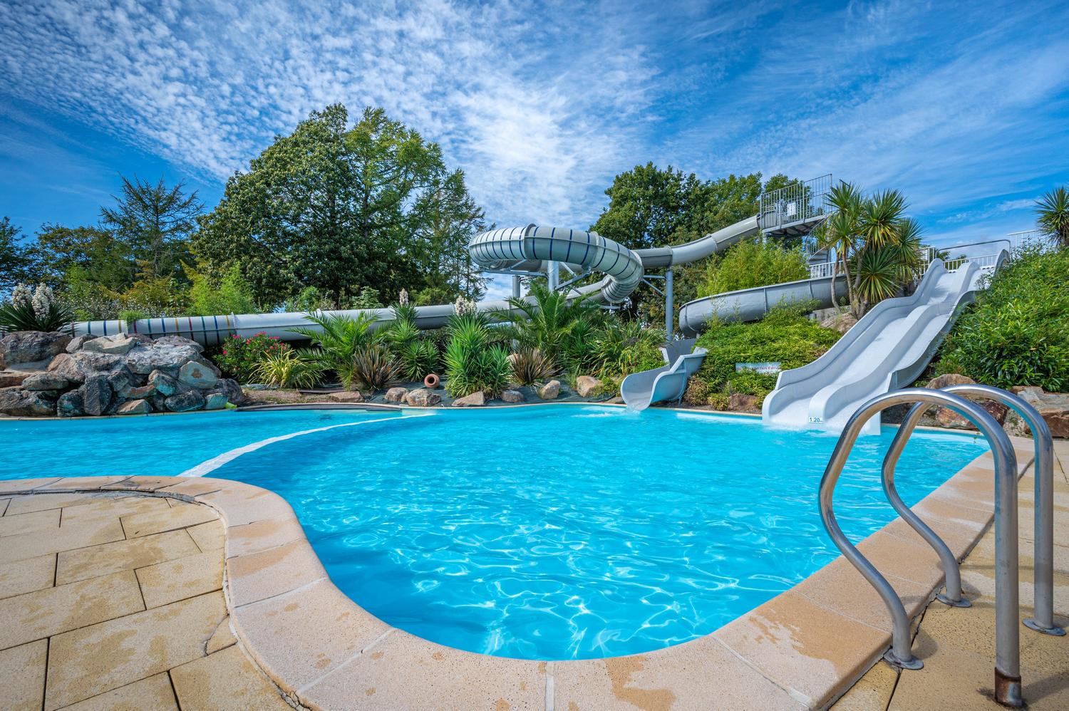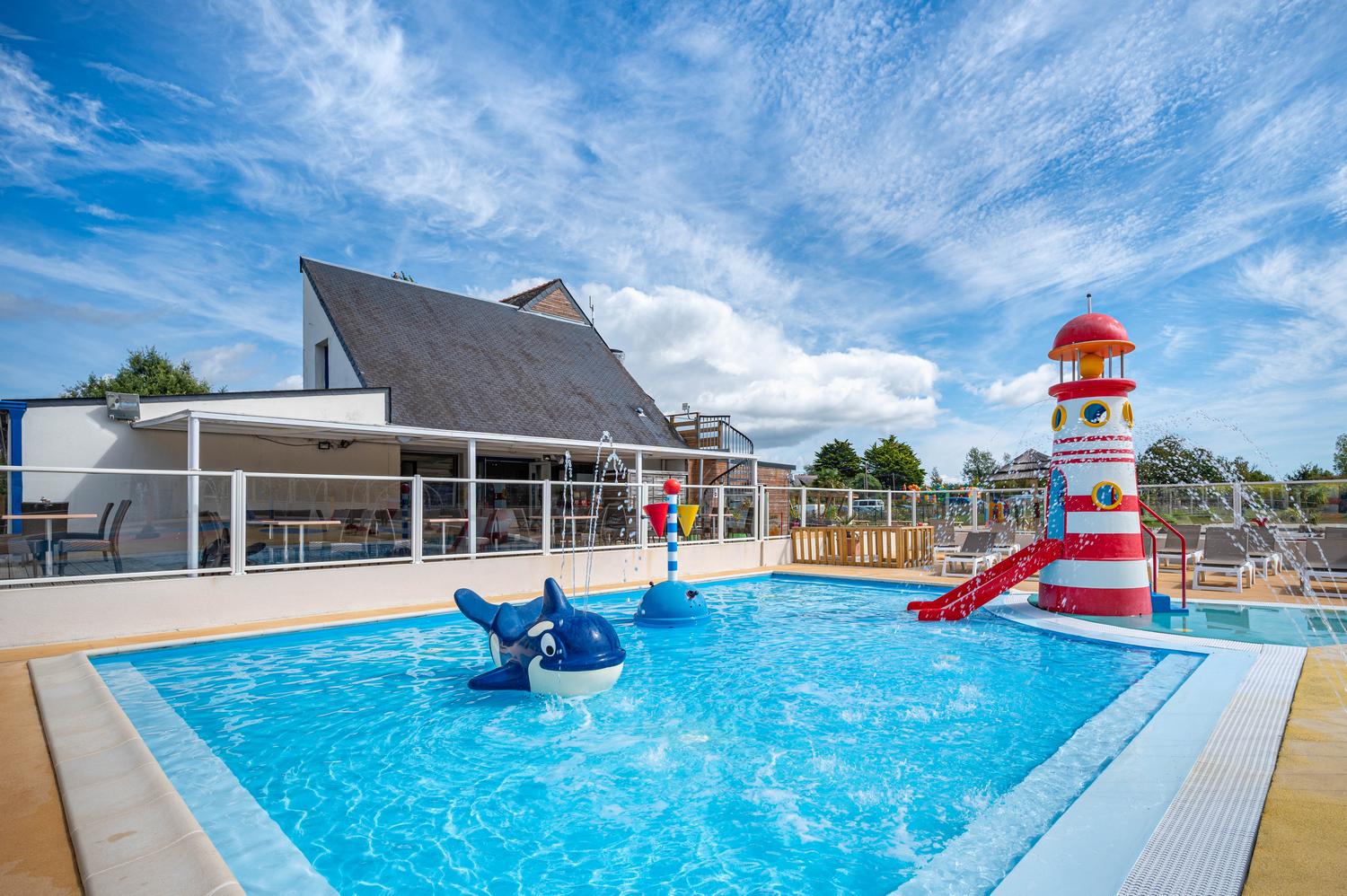 Le camping Kerzerho dispose d’un parc aquatique complet : piscine couverte chauffée avec grand bassin de natation, idéale pour nager ou jouer en famille, et espace extérieur avec toboggans, pataugeoires ludiques et transats pour se détendre au soleil.