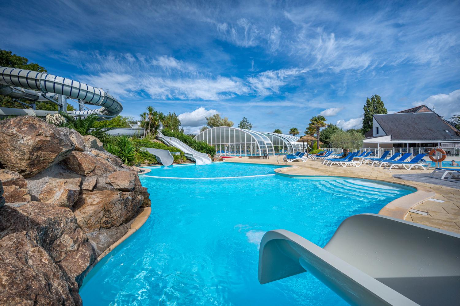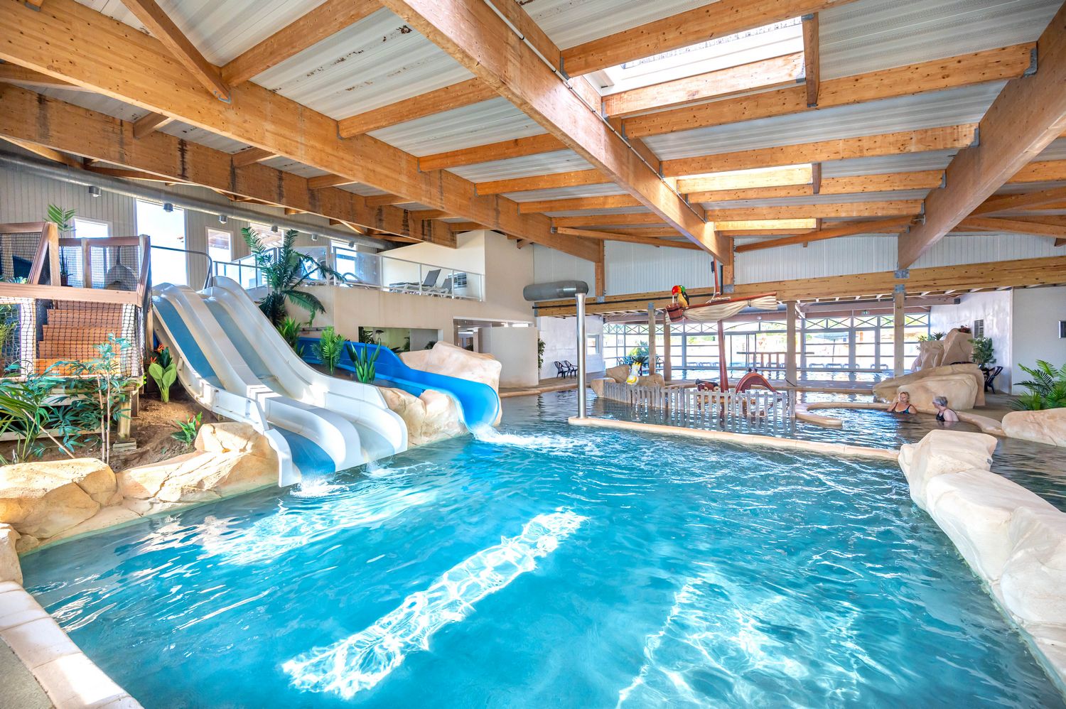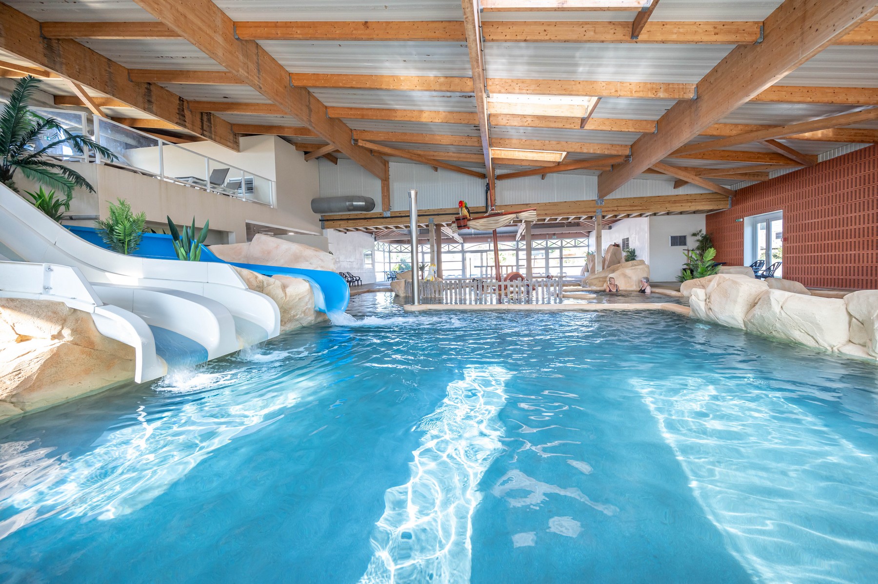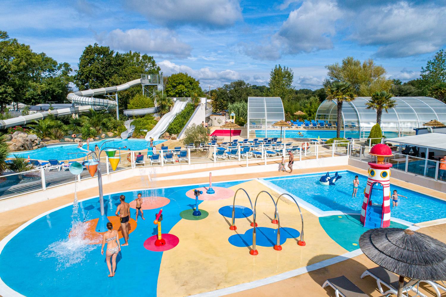 Parc aquatique chauffé avec piscine abritée, toboggans et jeux d’eau pour les plus jeunes.
