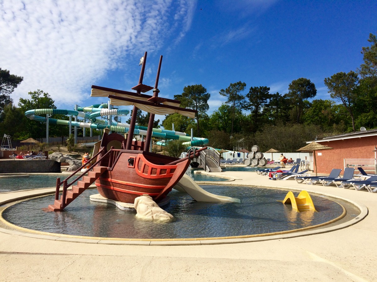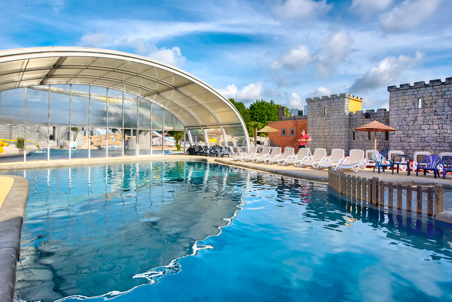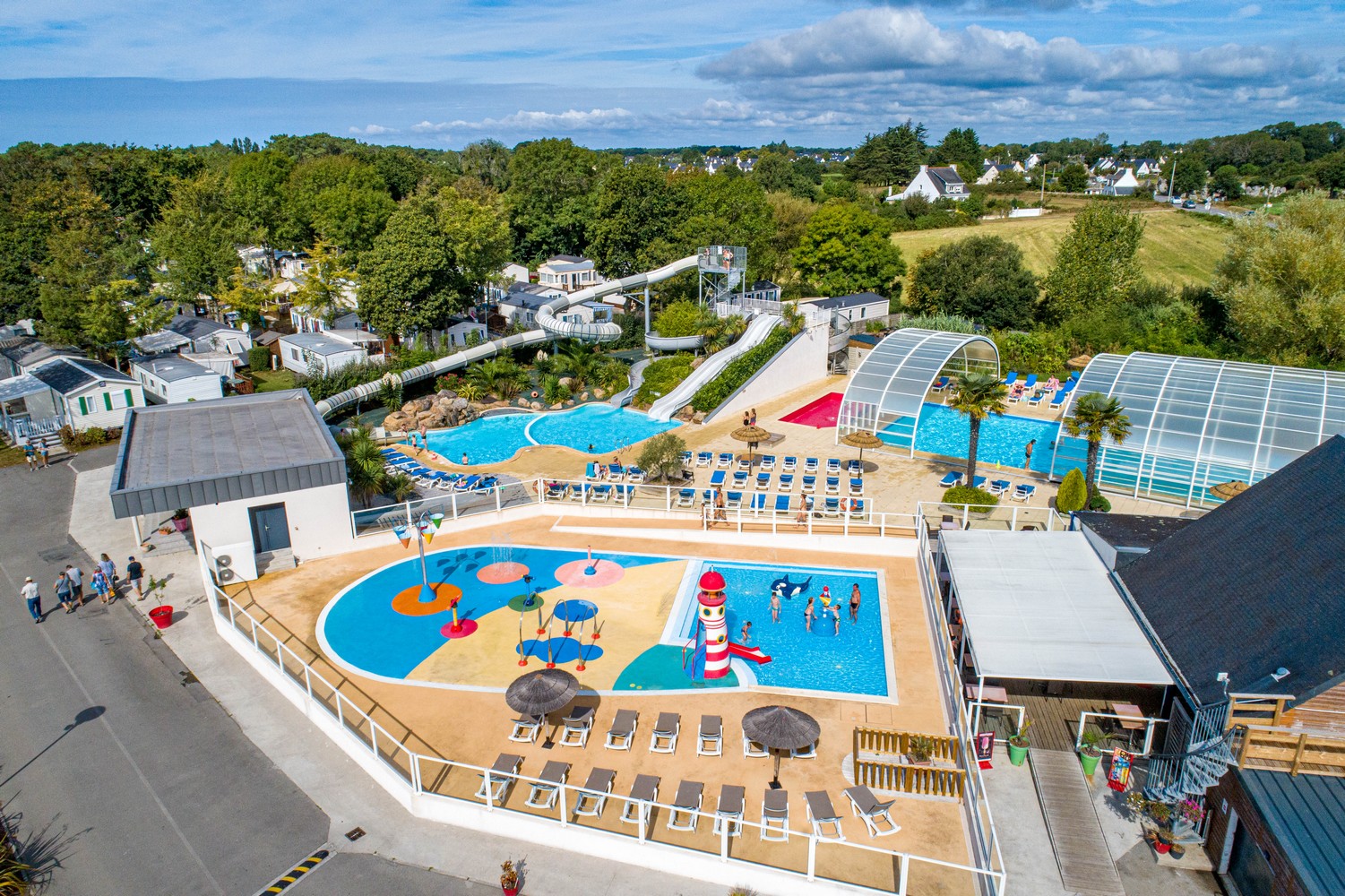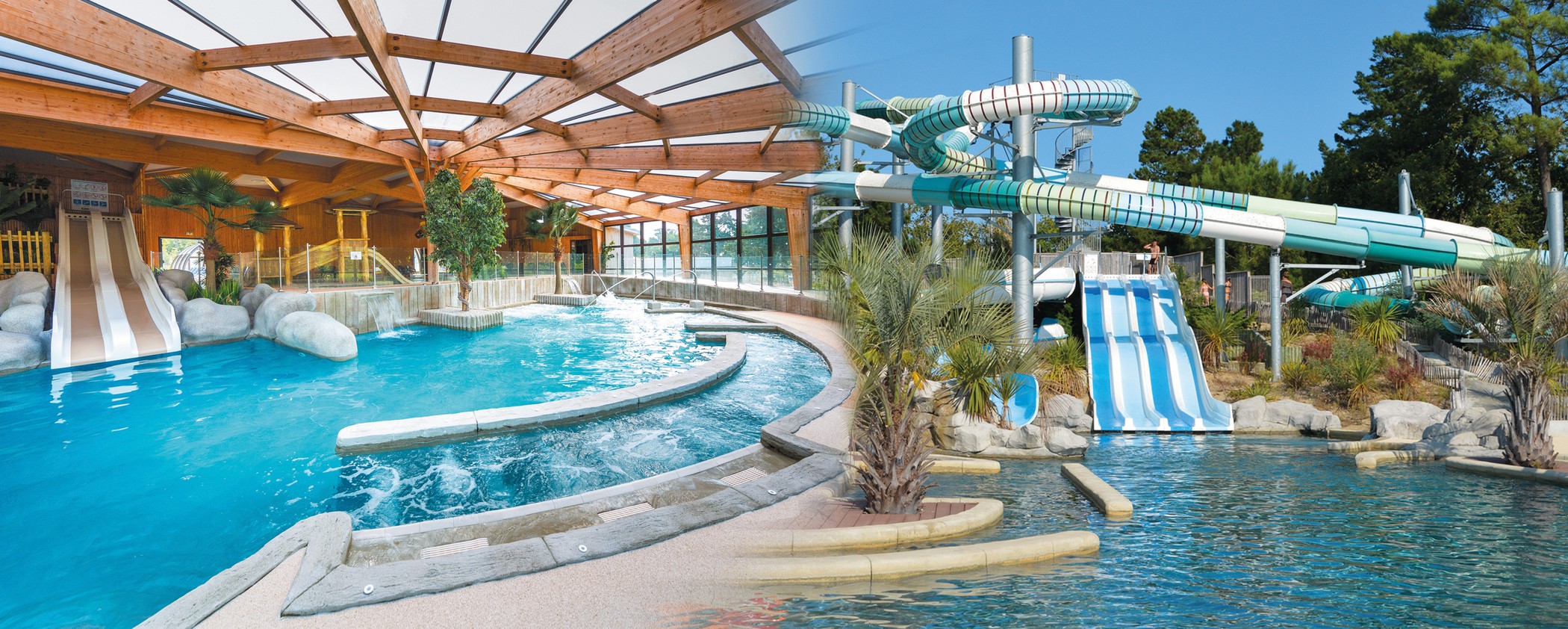 Parc aquatique chauffé avec piscine abritée, toboggans et jeux d’eau pour les plus jeunes.