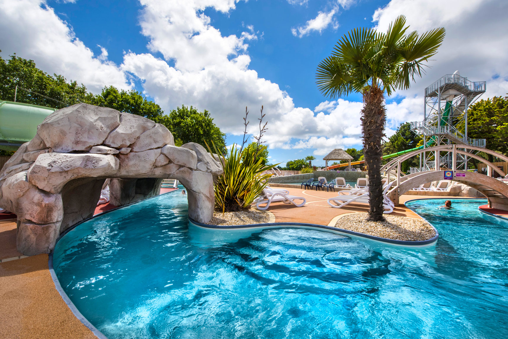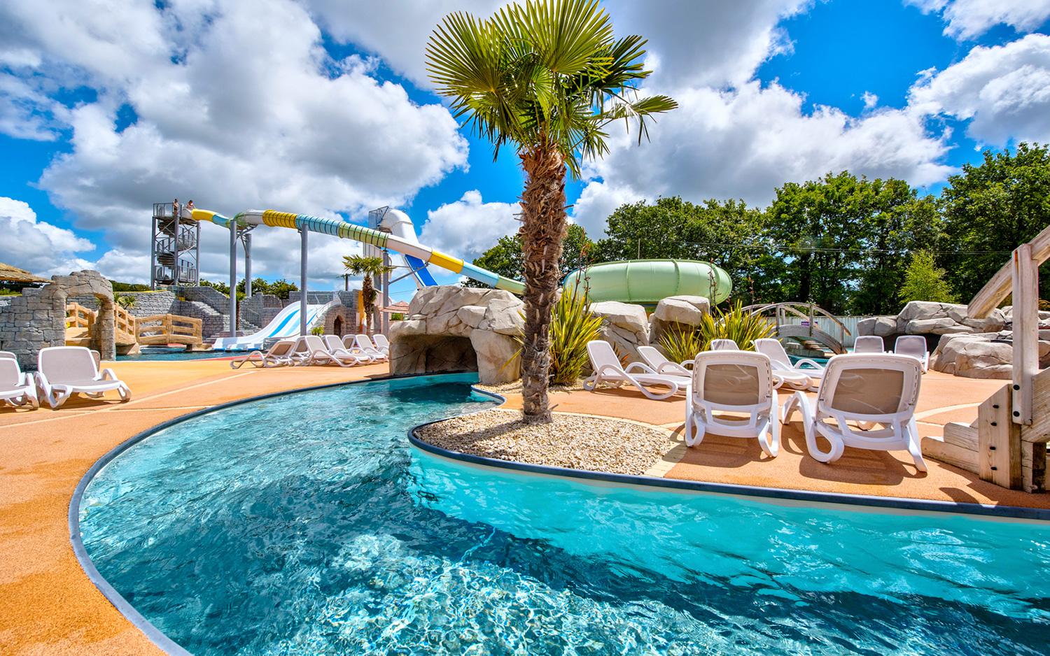 L’espace, baigné d’une ambiance tropicale avec cascades, roches, palmiers et végétation luxuriante, offre un cadre idéal pour partager des moments de détente et de plaisir en famille, quelle que soit la météo.