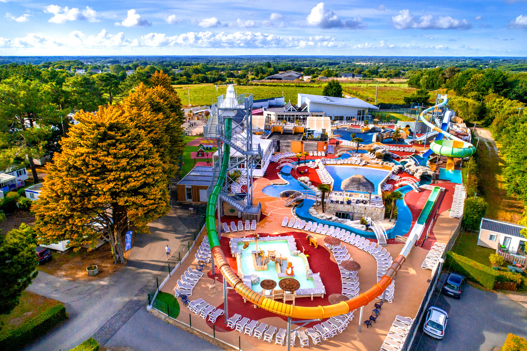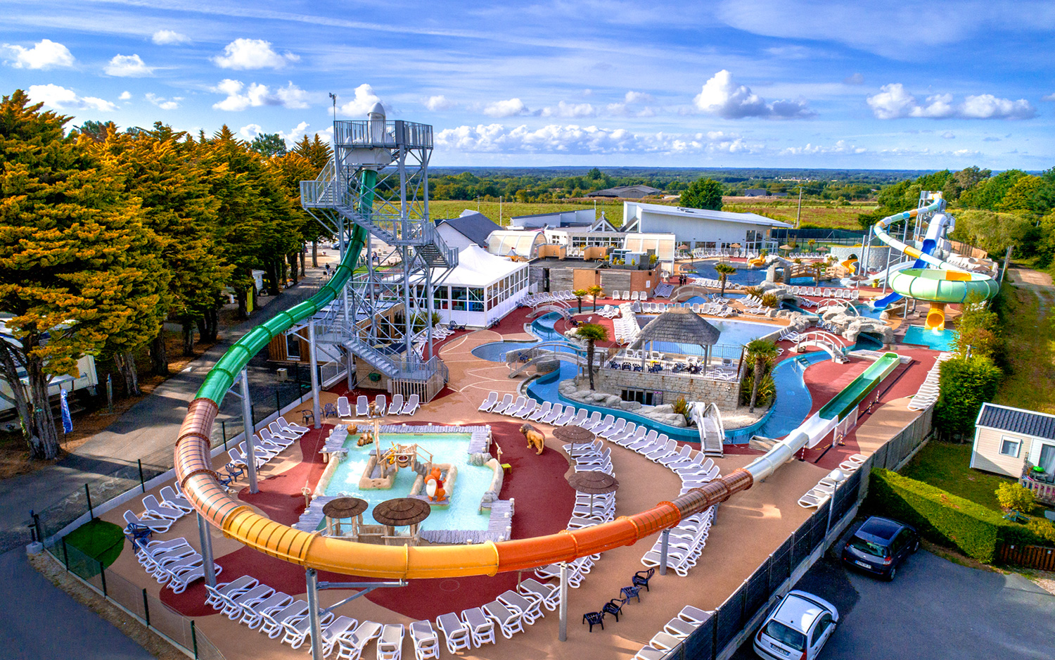 Un parc aquatique familial et sensation : piscine à vagues, toboggans à sensations, pentagliss, rivière à courant, bassins chauffés et aires ludiques enfants.