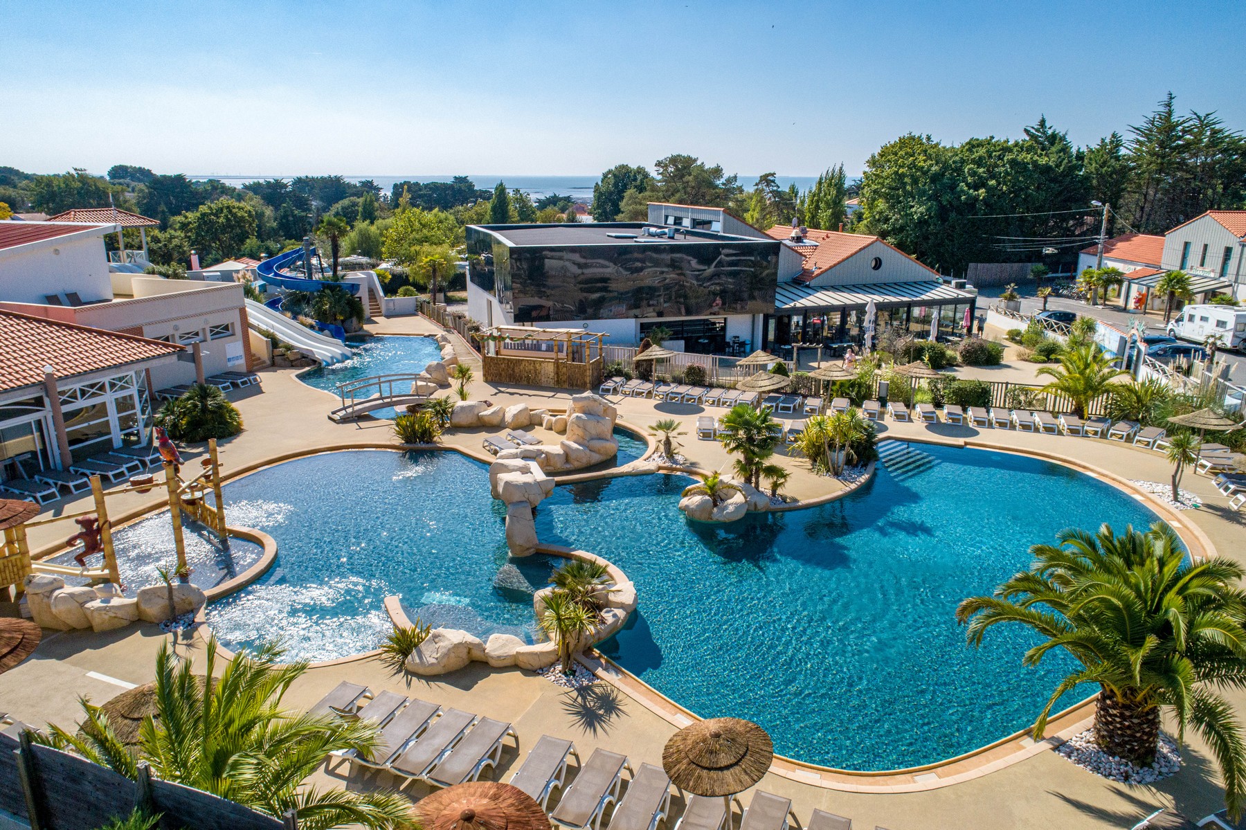 Au camping La Boutinardière à Pornic, profitez d’un immense espace aquatique chauffé de plus de 2000 m² dédié à la détente et aux loisirs. Entre piscine couverte chauffée dès avril, complexe extérieur avec toboggans, rivières, pataugeoires et balnéo, chacun trouve son bonheur. L’eau et l’air y sont chauffés pour garantir des baignades confortables toute la saison, dans un décor tropical mêlant cascades, palmiers et espaces de relaxation.